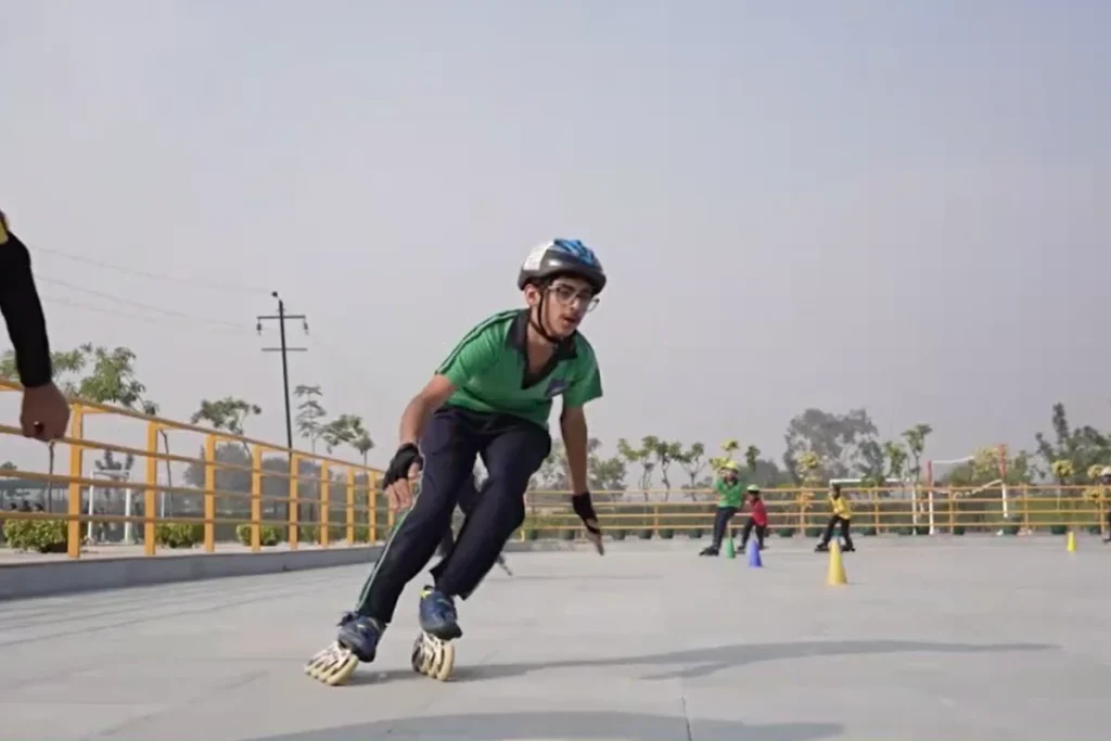 In our school, we have a 12,000-square-foot skating arena where students explore the thrill of skating under the guidance of experienced coaches. The facility is equipped with top-quality gear and safety support bars to ensure a secure, enjoyable experience. The environment is designed to be supportive, enjoyable, and focused on skill development. Through this sport, they learn the art of balancing, which is just as important in life.
